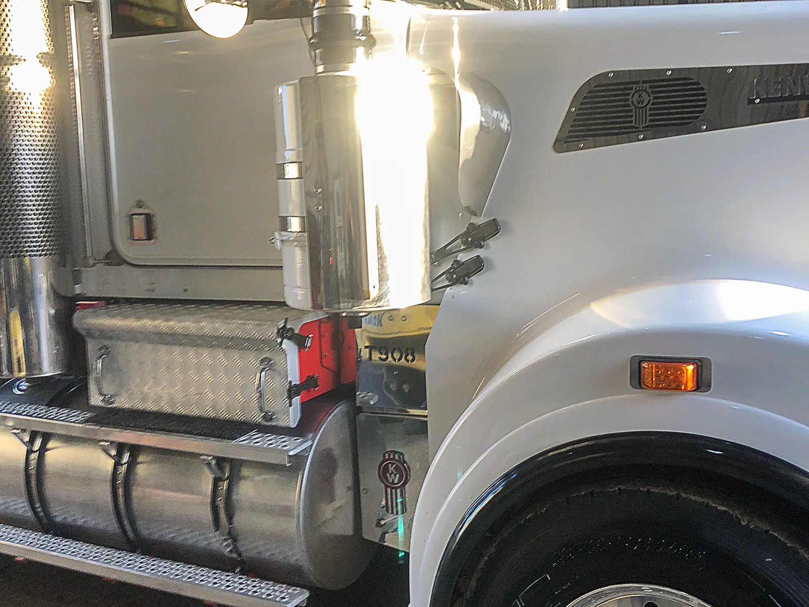 Custom goose neck horse float: (At left) Before complete exterior machine cut & polish, alloy polish. (At right) After complete exterior detail, ready for sale.